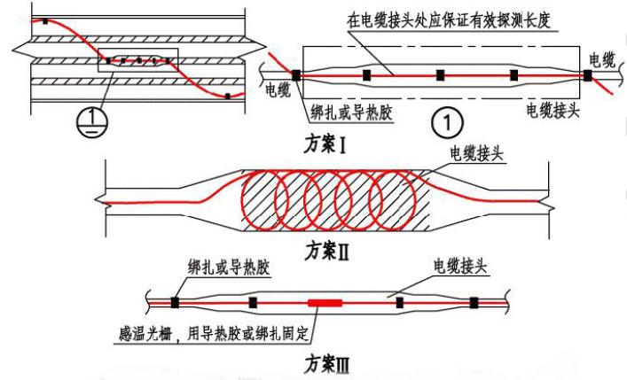 線型感溫火災探測器應采用接觸式的敷設方式對隧道內的所有的動力電纜進行探測;分布式線型光纖感溫火災探測器在電纜接頭、端子等發熱部位敷設時,其感溫光纜的延展長度不應少于探測單元長度的1.5 倍,在電纜接頭處應采用方案Ⅱ的方式;光纖光柵線型感溫火災探測器在電纜接頭、端子等發熱部位應設置感溫光柵單元,應才用方案Ⅰ、Ⅲ的方式。如圖6 所示: