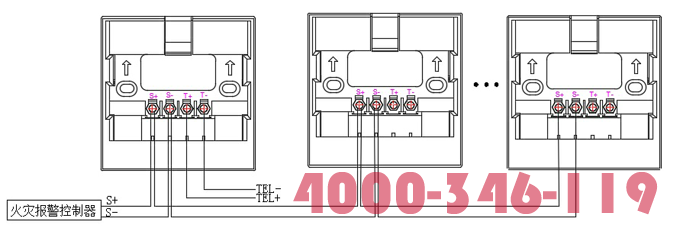 “S+”、“S-”為總線端子,接入火災(zāi)報警控制器;“T+”、“T-”為對講電話接線端子,可根據(jù)需要接入消防電話主機(jī)。